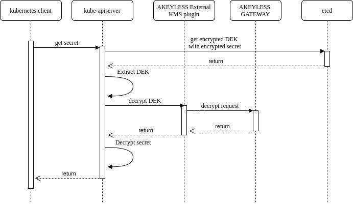 - akeyless-kms-plugin decrypts the DEK with a KEK