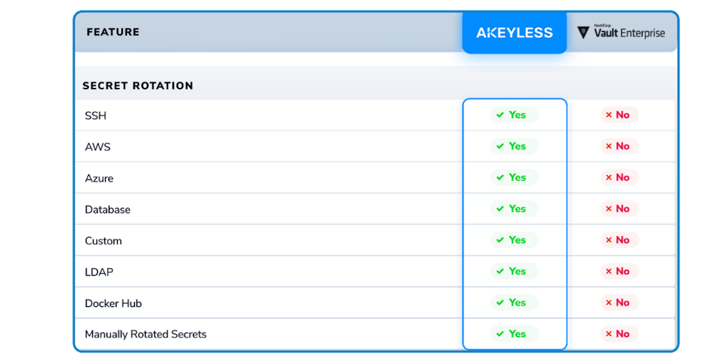 Akeyless automates secret rotation across a broader range of platforms than HashiCorp Vault, minimizing manual intervention. It supports dynamic secrets for custom targets, RDP, Docker Hub, Ping Client, and legacy/on-prem environments. Learn more.