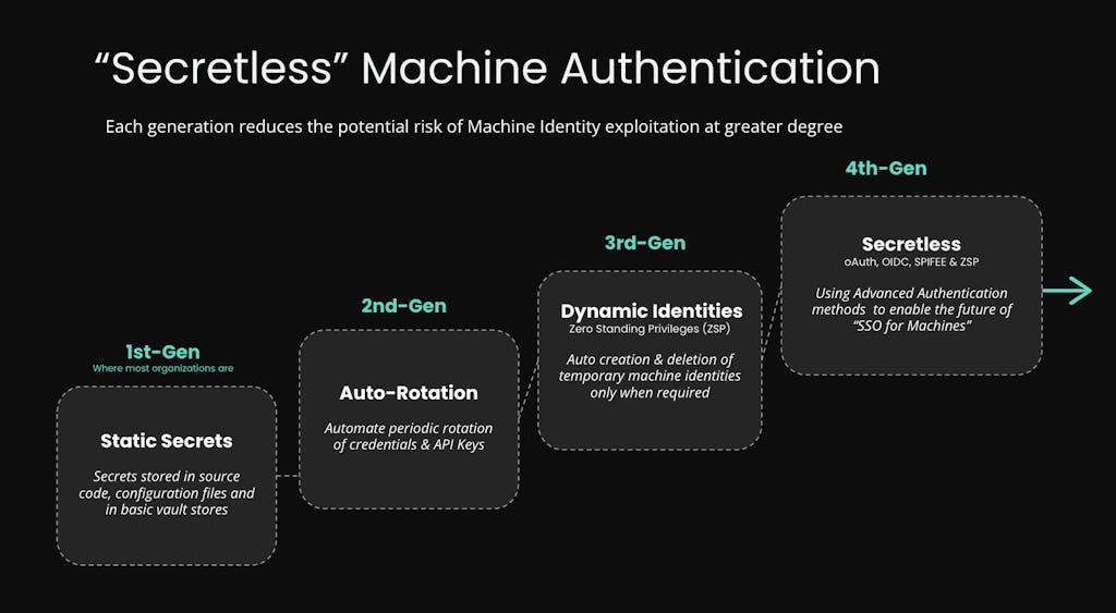 Secret management platforms like Akeyless serve as key enablers in this evolution. They guide teams from first-generation static secrets, where credentials are hardcoded or stored in basic vaults, to second-generation rotated secrets, which automate periodic credential changes to minimize exposure. From there, Akeyless facilitates a shift to third-generation dynamic secrets, implementing Zero Standing Privileges (ZSP) by generating temporary identities on-demand, ensuring access is granted only when needed and revoked immediately after. Ultimately, this paves the way to a fourth-generation secretless model, that uses advanced authentication methods like OAuth, OIDC, SPIFFE, and ZSP to achieve “SSO for Machines.”