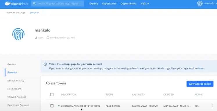 Now, if I look at Docker Hub, when I refresh the page, what I’m expected to see here is a temporary access token that was generated, like in this case, right? This was generated by the CI/CD platform, right? Just few seconds ago, right? Then when the job will be completed, this personal access token will be deleted.