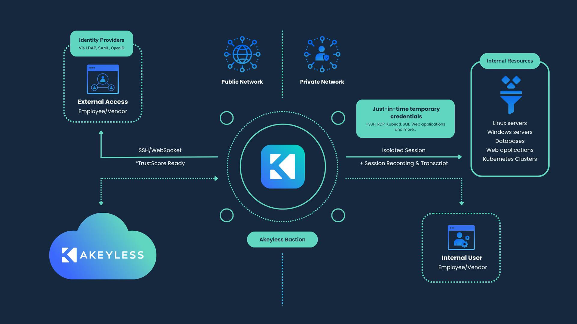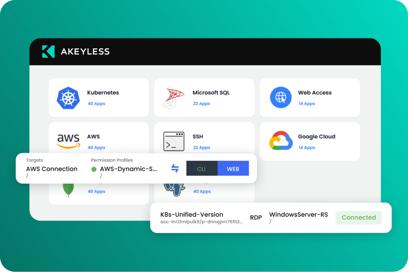 Learn more about Modern PAM with Secure Remote Access The Akeyless Platform's Secure Remote Access solution enables users to securely connect directly to resources – servers, databases, internal applications, and SaaS – in any of your environments, whether private, public, or on-prem.